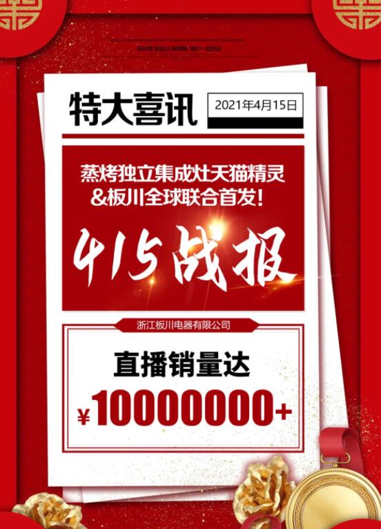 昨日,浙江板川電器有限公司蒸烤獨立集成灶天貓全球聯合首發儀式圓滿收官,直播促成銷量突破1000萬元。