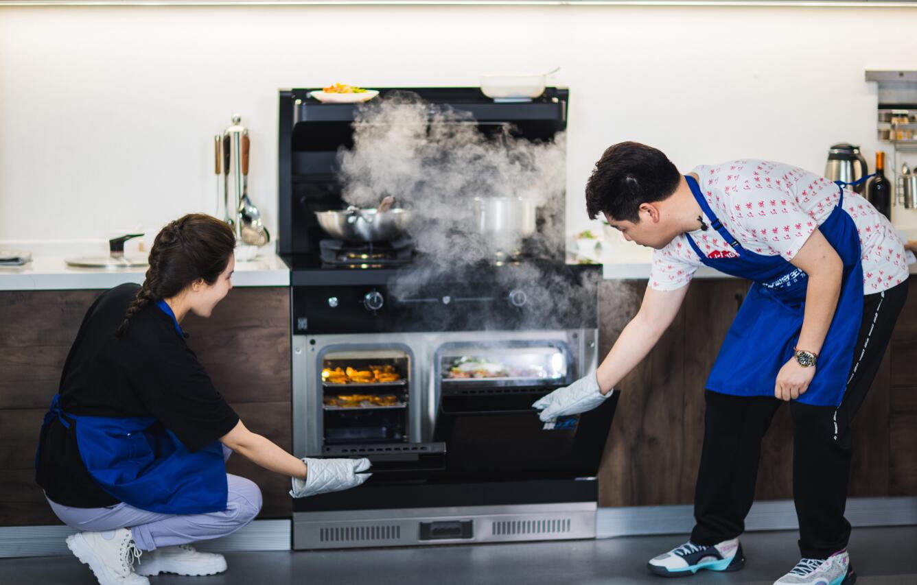 板川通過讓腔體由“1”進化為“2”重新劃分蒸烤區,以黃金分割達到空間利用率的最大化。左側烤箱與右側蒸箱互相獨立的設計讓蒸烤可以同步進行,大大提高了烹飪效率。而這樣的黃金搭檔,聯合5kw大火力灶具,多線并進突破普通人的烹飪上限,讓“10分鐘10道菜”這樣在從前不可能出現的奇跡成為真實發生的現實。