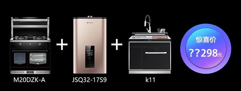訂購M20DZK-A集成灶+JSQ32-17S9燃氣熱水器+K11洗碗機款集成水槽享受驚喜價??298元!