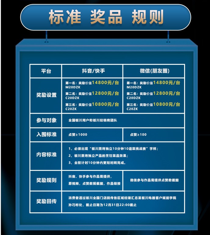 11月-12月參與千店盛宴活動的經銷商與消費者可以在抖音和微信平臺參與評比活動,前三名獲得者,高端集成灶0元帶回家!