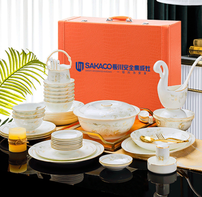 活動期間購買蒸烤獨立款集成灶、集成水槽產品,即可贈送價值1998元的中國景德鎮高檔骨質瓷餐具56件套裝1套