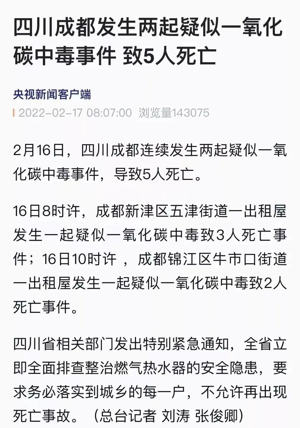 近日,成都連續發生多起一氧化碳中毒事件,“居家安全”、“燃氣安全”、“用電安全”引發關注。