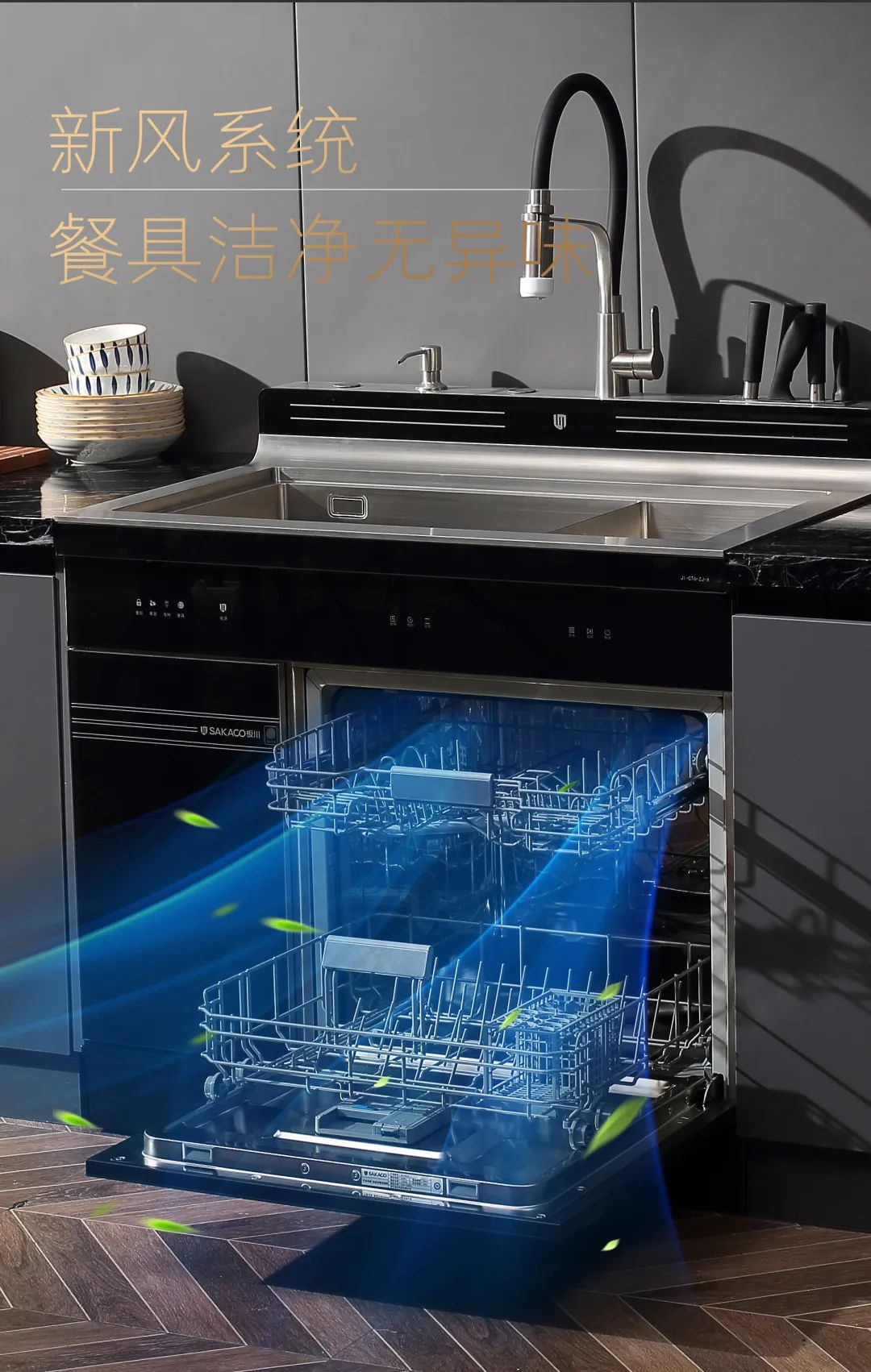 CT6集成水槽洗碗機,5重強力除菌,高效存儲,內部可放置12套碗具,高壓強力洗,溶油去污更徹底,高溫除菌率高達99%,封閉式熱風環流烘干,潔凈干爽。