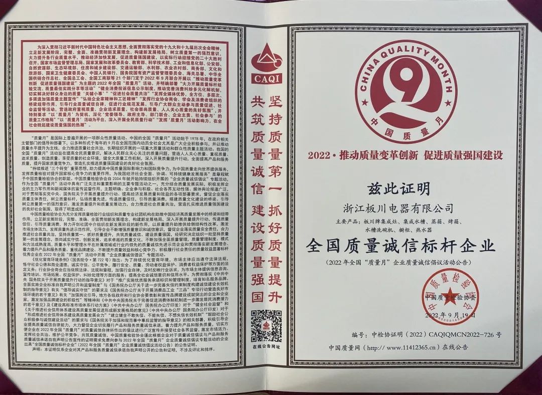 在經(jīng)過產(chǎn)品檢驗、第三方嚴格審查等環(huán)節(jié),浙江板川電器有限公司早已于2021年正式獲得了《浙江制造認證證書》,這也意味著板川安全集成灶成功通過了浙江制造業(yè)含金量最高的標準認證,獲得了“品字標”。