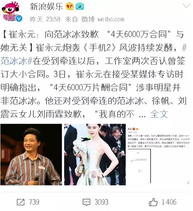 近日,崔永元爆范冰冰進(jìn)劇組4天拿走6千萬天價(jià)片酬,定大小兩份合同。此事件一出,網(wǎng)上瞬間炸開了鍋!對于范冰冰是否拿了天價(jià)片酬;崔永元舊事重提是否為炒作,網(wǎng)友們各執(zhí)一詞!