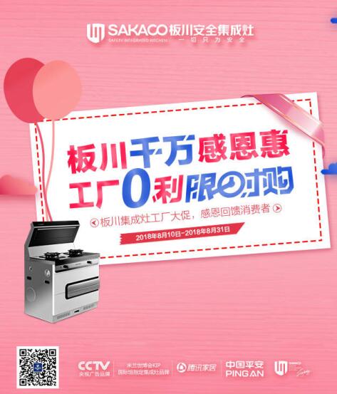 為感恩廣大消費者,板川安全集成灶更是將所有商品均以出廠價銷售,讓廣大消費者以最優惠的價格,樂享安全智尚的廚房生活。
