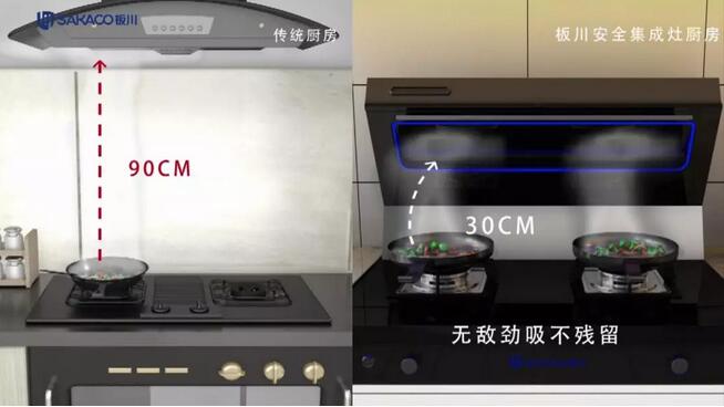 傳統煙灶的油煙機,油煙與油煙機的流通距離過長,油煙在向上被吸走的過程中,擴散嚴重,排煙率只有40%-60%,主婦們在廚房烹飪時,也會選擇緊閉門窗,防止油煙擴散。