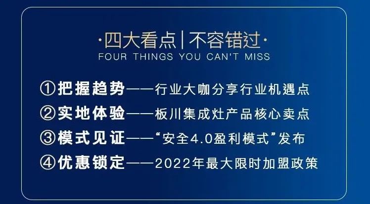 此次招商峰會(huì),除了前所未有的安全4.0盈利模式發(fā)布,還有更多精彩內(nèi)容值得你來(lái)。誠(chéng)邀行業(yè)大咖鼎力相助,為您深度解讀行業(yè)趨勢(shì);2022最大限時(shí)加盟政策,誠(chéng)意十足,全力以赴助您馳騁財(cái)富藍(lán)海。相信在本次會(huì)議中,您一定會(huì)受益匪淺。