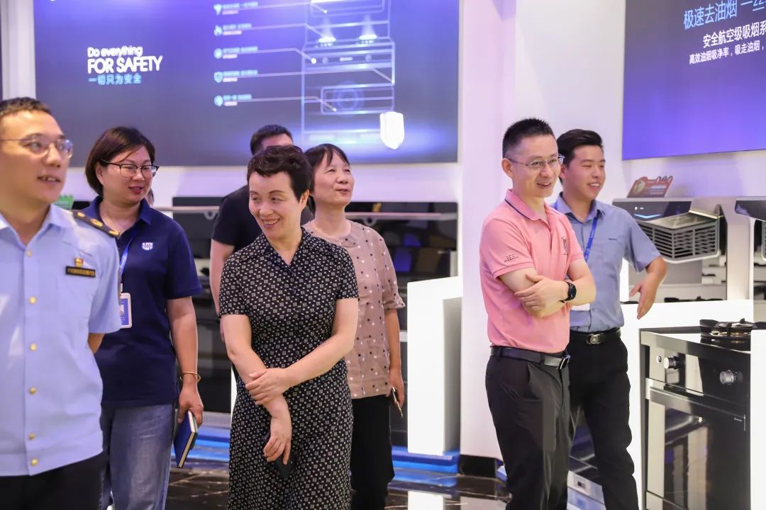 在浙江板川電器有限公司,組長鄭文娟一行首先參觀了板川電器品牌展廳,深入了解了板川安全集成灶的企業文化,并為板川電器的價值理念和企業遠景點贊。